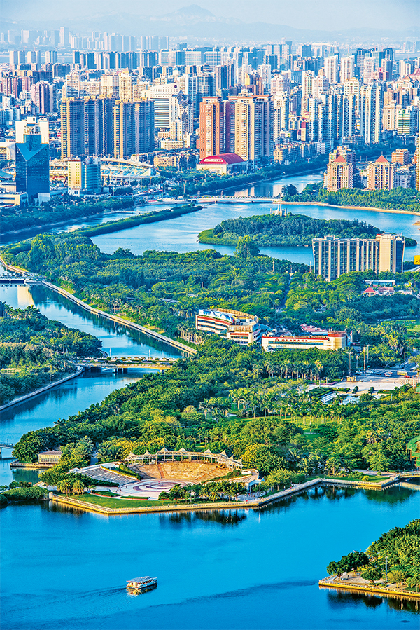 圖為筼筜湖畔的白鷺洲公園景色。高處俯瞰,筼筜湖的一灣碧水,如同一條藍(lán)絲帶飄入鷺島廈門。 廈門市委宣傳部供圖
