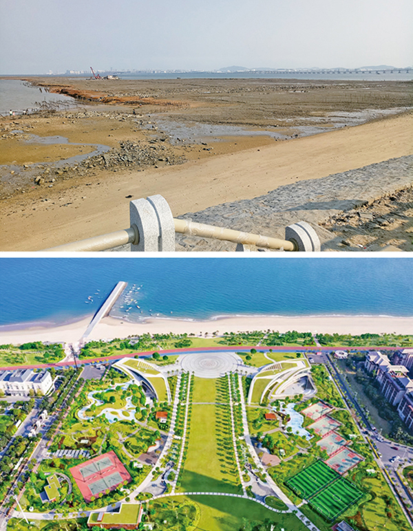 灣區(qū)較多、“灣中有灣”的廈門,在國內(nèi)沿海地區(qū)率先提出灣區(qū)綜合整治理念,實(shí)施海堤開口清淤整治,重構(gòu)紅樹林岸線,修復(fù)沙灘,構(gòu)建優(yōu)美海灣人居環(huán)境。圖為廈門同安灣整治前后對比,上圖為整治前畫面,下圖為整治后畫面。 自然資源部第三海洋研究所供圖