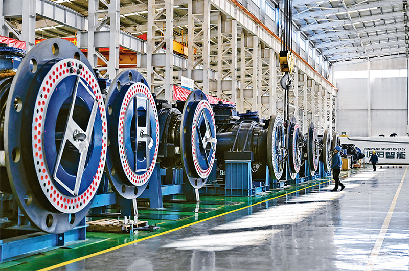 綠色低碳是新型工業(yè)化的生態(tài)底色。近年來,內(nèi)蒙古自治區(qū)錫林郭勒盟依托風(fēng)、光資源優(yōu)勢(shì),大力發(fā)展風(fēng)電裝備等新能源制造產(chǎn)業(yè)。圖為2024年5月15日,工人在錫林郭勒盟明陽(yáng)新能源有限公司總裝車間作業(yè)。 新華社記者 李志鵬/攝