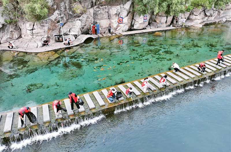 2024年6月5日是世界環(huán)境日。世界環(huán)境日前后,各地志愿者、環(huán)保工作者等以實際行動保護生態(tài)環(huán)境,守護美麗家園。圖為2024年6月4日,志愿者在河北省邯鄲市峰峰礦區(qū)黑龍洞風景區(qū)撿拾水面雜物。 新華社發(fā) 郝群英/攝