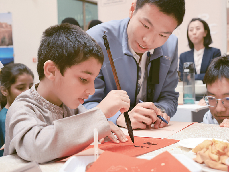 設立孔子學院,旨在促進中文國際傳播,加深世界人民對中國語言文化的了解,增進中外教育人文交流。圖為2024年1月29日,在沙特阿拉伯首都利雅得的蘇爾坦親王大學,一名兒童在孔子學院展位體驗中國書法。 新華社記者 王海洲/攝