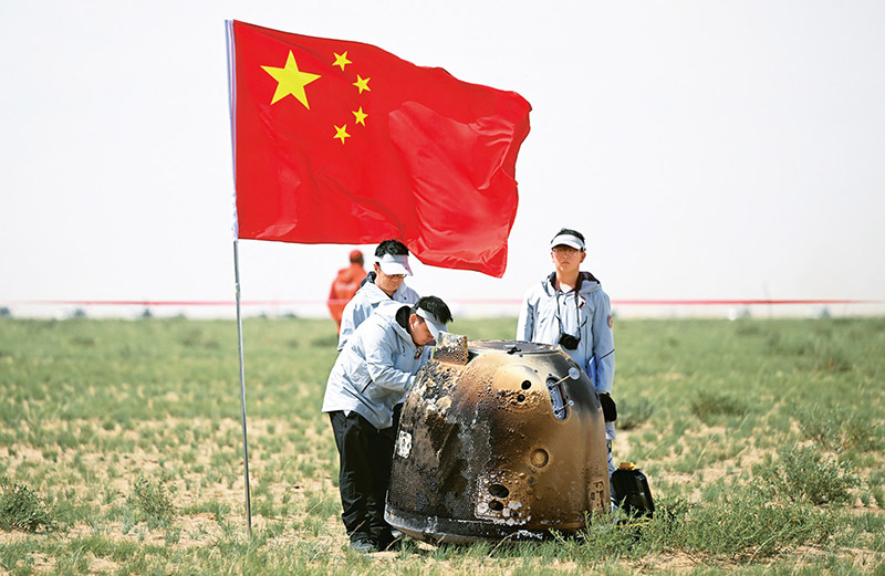 2024年6月25日14時(shí)7分,嫦娥六號(hào)返回器攜帶來自月背的月球樣品安全著陸在內(nèi)蒙古四子王旗預(yù)定區(qū)域。習(xí)近平總書記代表黨中央、國務(wù)院和中央軍委致電祝賀探月工程嫦娥六號(hào)任務(wù)取得圓滿成功??倳浽谫R電中指出,嫦娥六號(hào)在人類歷史上首次實(shí)現(xiàn)月球背面采樣返回,是我國建設(shè)航天強(qiáng)國、科技強(qiáng)國取得的又一標(biāo)志性成果。圖為嫦娥六號(hào)返回器回收現(xiàn)場(chǎng)。 新華社記者 貝赫/攝
