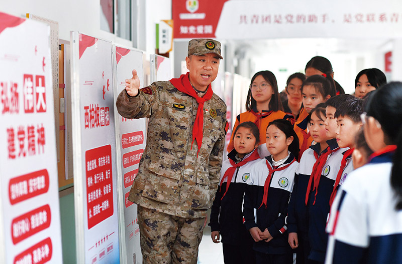 樹(shù)高千丈必有根,江流萬(wàn)里總有源。讀懂中國(guó)共產(chǎn)黨,必須讀懂中國(guó)共產(chǎn)黨的精神;讀懂中國(guó)共產(chǎn)黨的精神,必須讀懂中國(guó)共產(chǎn)黨的精神之源。圖為2024年3月18日,在山東省青島市市北區(qū)延安二路小學(xué)舉行“國(guó)防教育進(jìn)校園”主題活動(dòng)上,宣講員為學(xué)生們講述偉大建黨精神。 中新社發(fā) 王海濱/攝