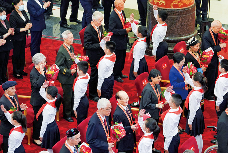 2021年6月29日,慶祝中國共產(chǎn)黨成立100周年“七一勛章”頒授儀式在北京人民大會堂金色大廳隆重舉行。這是少先隊員向勛章獲得者獻花,敬禮致意。 新華社記者 高潔/攝