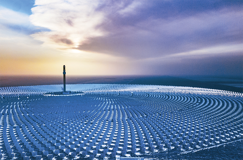 圖為2024年2月26日,在茫茫雪地里持續(xù)吸光發(fā)熱的首航敦煌100兆瓦熔鹽塔式光熱發(fā)電站。 人民圖片 王斌銀/攝