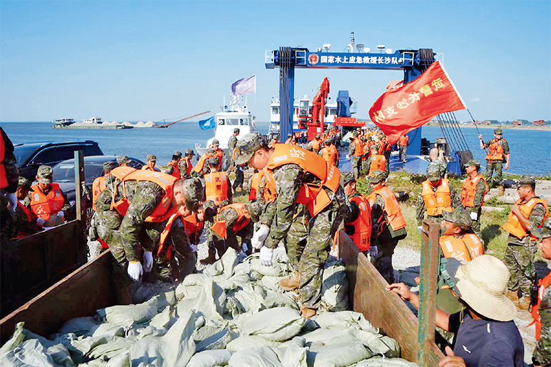 萬(wàn)眾一心、眾志成城,集中力量辦大事的制度優(yōu)勢(shì)在應(yīng)對(duì)風(fēng)險(xiǎn)挑戰(zhàn)中充分彰顯。圖為2024年7月6日,武警湖南總隊(duì)官兵在湖南省岳陽(yáng)市華容縣團(tuán)洲垸受災(zāi)現(xiàn)場(chǎng)第二道防線(xiàn)搬運(yùn)沙袋加固堤壩。 新華社發(fā) 張森/攝
