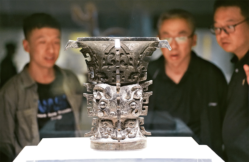 歷史文化遺產承載著中華民族的基因和血脈。何尊是西周成王時期一個名叫“何”的宗室貴族所做的祭器,尊內底鑄銘文中有“宅茲中國”四字,是“中國”一詞最早的實物見證。圖為2024年5月9日,游客在陜西寶雞青銅器博物院內參觀西周文物何尊。 新華社記者 邵瑞/攝