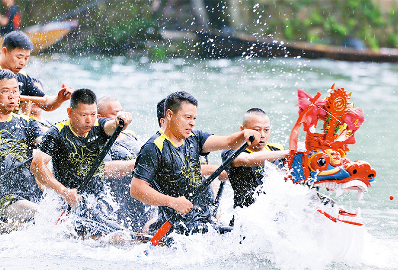 端午節(jié)是中華民族重要的傳統(tǒng)節(jié)日,也是傳承中華優(yōu)秀傳統(tǒng)文化的重要載體。圖為2024年6月10日,浙江杭州西溪國家濕地公園浪花飛濺,鼓點激昂,上演激動人心的端午傳統(tǒng)項目“龍舟勝會”。 中新社發(fā) 周方玲/攝