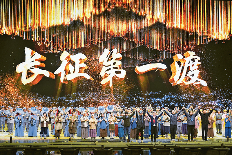 紅軍將士用生命和熱血鑄就的偉大長征精神,是革命文化的重要組成部分,具有穿越時空的強大感召力。2023年3月23日,大型紅色文旅史詩《長征第一渡》在江西于都長征大劇院首演,觀眾在沉浸式體驗中感受長征時期的崢嶸歲月。圖為演出現(xiàn)場。 新華社記者 萬象/攝