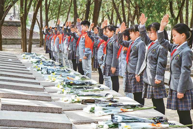 清明節(jié)前,山東省濟南市各界群眾來到濟南革命烈士陵園緬懷歷史,祭奠先烈。截至目前,濟南革命烈士陵園墓區(qū)安葬烈士1910名,其中有名烈士1221名、無名烈士689名,包括王盡美、鄧恩銘、劉謙初等23位著名烈士。圖為2024年4月2日,少年兒童在濟南革命烈士陵園向烈士敬禮。 新華社記者 朱崢/攝