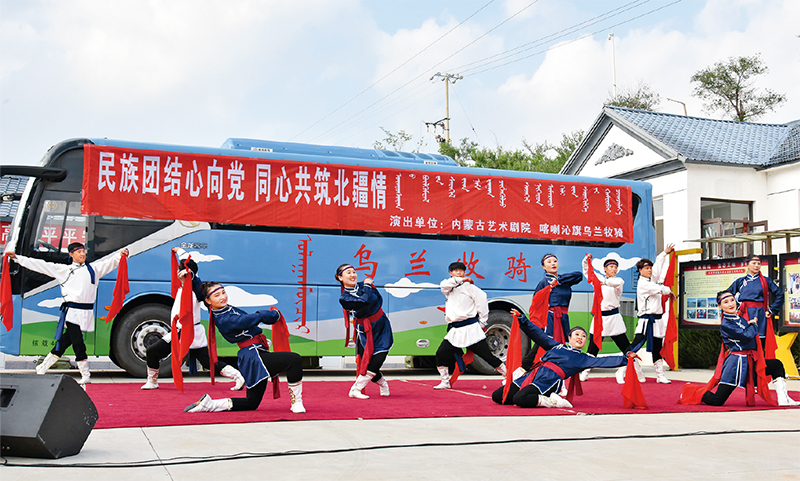 圖為2023年8月12日,喀喇沁旗烏蘭牧騎聯(lián)合內(nèi)蒙古藝術(shù)劇院在馬鞍山村開展“民族團(tuán)結(jié)心向黨 同心共筑北疆情”文藝演出。 喀喇沁旗委宣傳部供圖
