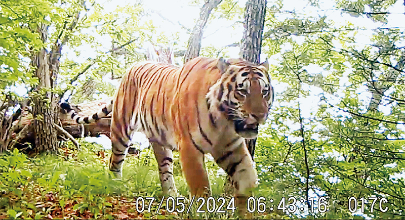 圖為2024年7月5日東北虎豹國家公園監(jiān)測系統(tǒng)拍攝到的野生東北虎。 東北虎豹國家公園供圖