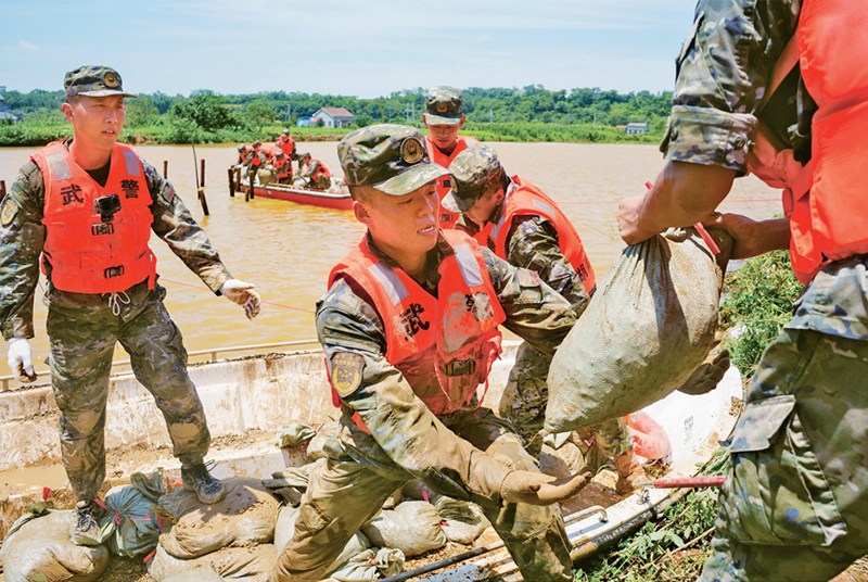 湖南省岳陽(yáng)市華容縣團(tuán)洲垸洞庭湖一線堤防發(fā)生決口后,解放軍和武警部隊(duì)官兵、民兵多支力量全力開展巡堤固壩、封堵管涌等任務(wù)作業(yè)。圖為2024年7月8日上午,武警湖南總隊(duì)組織官兵在堤邊搬運(yùn)沙袋,封堵突發(fā)管涌。 武警湖南總隊(duì) 張森/攝