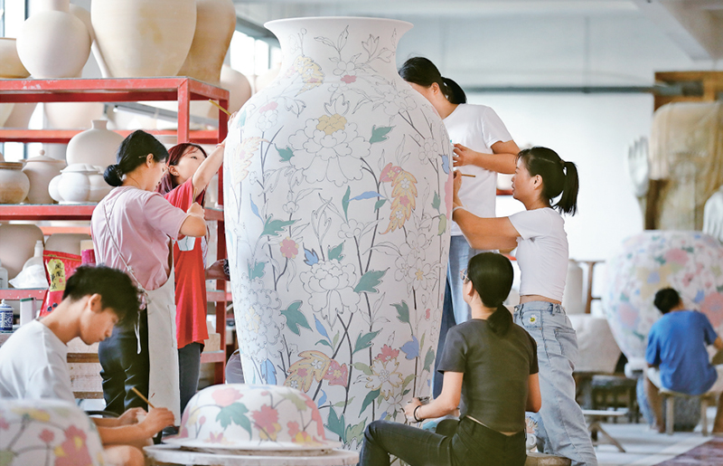 景德鎮(zhèn)很古老,它承載著流傳千年的技藝與記憶;景德鎮(zhèn)又很現(xiàn)代,它孕育著熱情澎湃的創(chuàng)新與創(chuàng)造。陶溪川文創(chuàng)街區(qū)是景德鎮(zhèn)工業(yè)遺存保護(hù)與活化的代表性成果,街區(qū)由原國(guó)營(yíng)宇宙瓷廠改造建成,一座座陶瓷老廠房化身時(shí)尚的陶瓷藝術(shù)作坊、博物館,原來的燒煉車間變身美術(shù)館、咖啡店、酒店,長(zhǎng)滿爬山虎的紅磚房與老窯爐、煙囪、水塔相望矗立,處處彰顯著歷史與現(xiàn)代的融合之美,被評(píng)為“國(guó)家級(jí)文化產(chǎn)業(yè)示范園區(qū)”。新科技與新創(chuàng)意也給陶瓷產(chǎn)業(yè)帶來新的“打開”方式:瓷刻藝術(shù)“牽手”AI技術(shù),畫出科技感十足的瓷板畫;3D打印運(yùn)用到陶瓷領(lǐng)域,材料每層精確至0.5mm;智能生產(chǎn)線聯(lián)合手工作坊,個(gè)性化陶瓷搭上智能制造的“快車”……2023年,景德鎮(zhèn)陶瓷工業(yè)總產(chǎn)值達(dá)861.25億元,其中先進(jìn)陶瓷總產(chǎn)值達(dá)253億元,同比增長(zhǎng)93.6%,連續(xù)3年實(shí)現(xiàn)翻番式增長(zhǎng)。