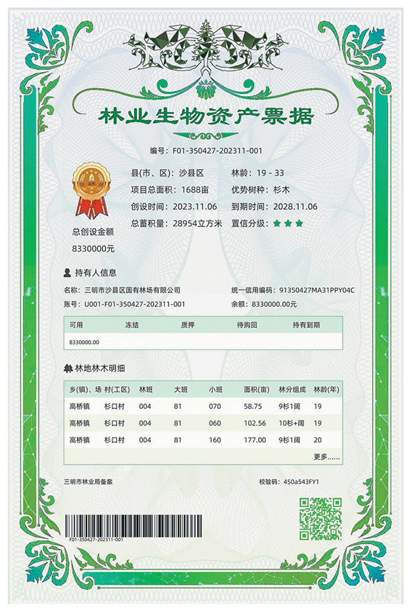 圖為2023年11月6日福建省三明市發(fā)布的全國(guó)首張林業(yè)生物資產(chǎn)票據(jù)。 福建沙縣農(nóng)村產(chǎn)權(quán)交易中心供圖