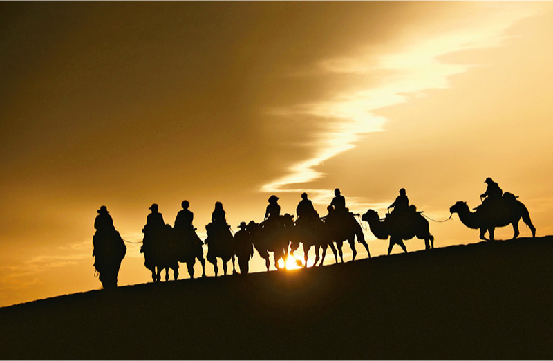 新時(shí)代以來,文化和旅游深度融合發(fā)展體制機(jī)制不斷健全,成功走出了一條獨(dú)具特色的中國旅游發(fā)展之路。圖為2024年9月1日清晨,游客在甘肅省敦煌市鳴沙山月牙泉景區(qū)乘騎駱駝,欣賞大漠風(fēng)光,體驗(yàn)絲路風(fēng)情。 新華社發(fā) 張曉亮/攝