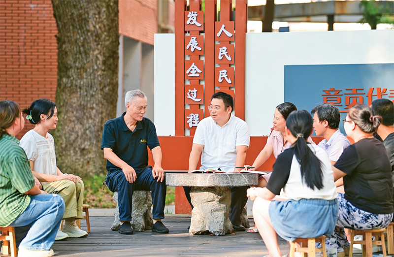 江西省贛州市章貢區(qū)高標準推進基層立法聯(lián)系點建設運行,通過“開門立法”等方式,有效架起社情民意“連心橋”。圖為2024年9月9日,在章貢區(qū)南外街道紅環(huán)路社區(qū),當?shù)亓⒎?lián)絡員同社區(qū)居民進行交流,就相關法律立法進行意見征詢。 人民圖片 胡江濤/攝