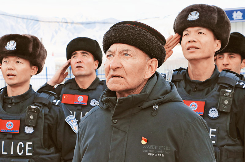 圖為2022年1月2日,巴依卡·凱力迪別克與邊境民警、護(hù)邊員一同升國旗、唱國歌。 喀什邊境管理支隊(duì)供圖 謝清肆/攝