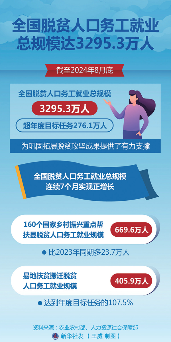 今年以來(lái)各級(jí)各相關(guān)部門(mén)深入開(kāi)展防止返貧就業(yè)攻堅(jiān)行動(dòng),截至8月底,全國(guó)脫貧人口務(wù)工就業(yè)總規(guī)模達(dá)到3295.3萬(wàn)人,超年度目標(biāo)任務(wù)276.1萬(wàn)人,為鞏固拓展脫貧攻堅(jiān)成果提供了有力支撐。 新華社發(fā) 王威/制圖