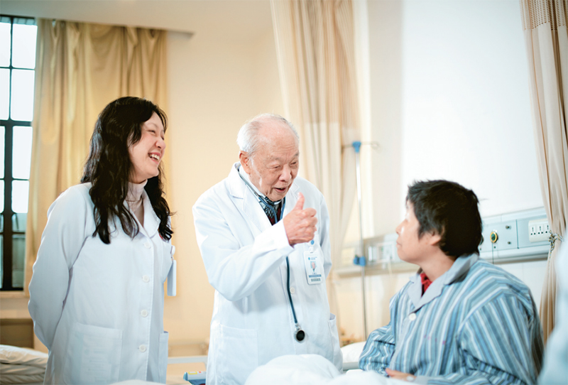圖為王振義(中)與患者親切交流。 上海交通大學(xué)醫(yī)學(xué)院附屬瑞金醫(yī)院供圖