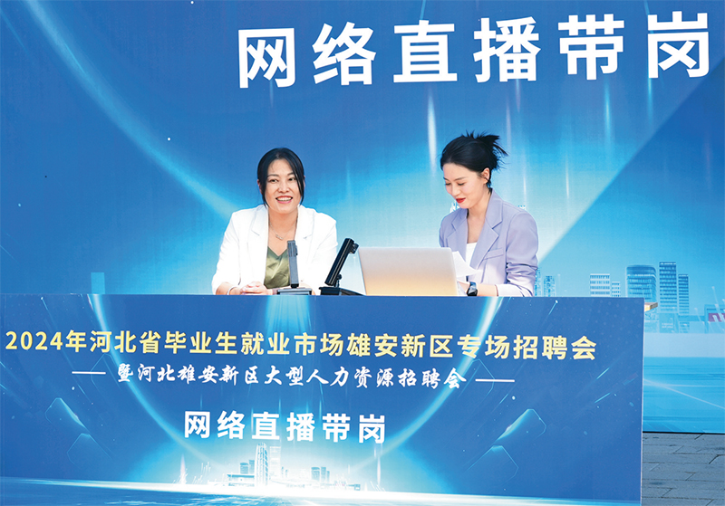 高校畢業(yè)生等青年群體就業(yè)是就業(yè)工作的重中之重,事關(guān)就業(yè)基本盤的穩(wěn)定。2024年9月25日,雄安新區(qū)舉辦2024年河北省畢業(yè)生就業(yè)市場(chǎng)雄安新區(qū)專場(chǎng)招聘會(huì)暨河北雄安新區(qū)大型人力資源招聘會(huì)。圖為當(dāng)日招聘單位代表在現(xiàn)場(chǎng)進(jìn)行網(wǎng)絡(luò)直播帶崗。 新華社發(fā) 落飛麟/攝