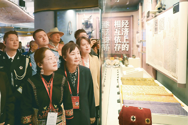 2024年9月28日至10月1日,全國(guó)少數(shù)民族參觀(guān)團(tuán)在北京參觀(guān)考察,感受新時(shí)代偉大成就。圖為參觀(guān)團(tuán)在民族文化宮參觀(guān)鑄牢中華民族共同體意識(shí)文物古籍展,了解中華民族共同體形成發(fā)展的歷史。 民族畫(huà)報(bào)社供圖 陳濤/攝