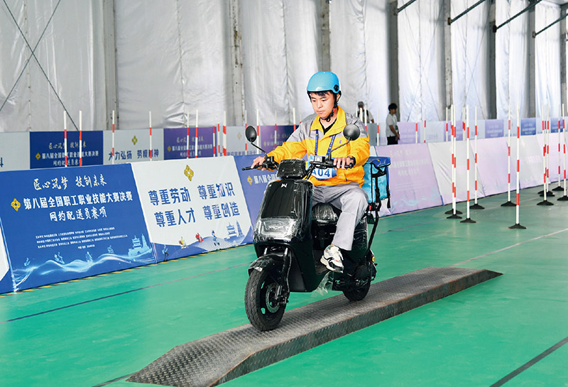 2024年9月11日,由全國總工會、人力資源和社會保障部等單位主辦的第八屆全國職工職業(yè)技能大賽決賽在陜西開幕。近550名選手參加了人工智能訓(xùn)練師、汽車維修工(智能網(wǎng)聯(lián)新能源汽車方向)、網(wǎng)約配送員等6個決賽工種的比賽。圖為決賽開幕當日,選手在位于西安國際會展中心的比賽場地參加網(wǎng)約配送員工種比賽。 新華社記者 張博文/攝