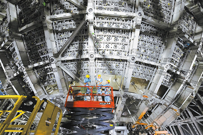 目前,全國職工總數(shù)約4.02億人,其中產(chǎn)業(yè)工人占職工隊伍總數(shù)的半數(shù)左右,這樣一支龐大的隊伍,蘊含著無窮的智慧和力量,是實現(xiàn)新時代新征程黨的目標任務(wù)的力量所在、底氣所在。圖為2024年10月10日,工人在中國科學(xué)院高能物理所江門中微子實驗建設(shè)場地安裝中心探測器上的光電倍增管。 新華社記者 金立旺/攝