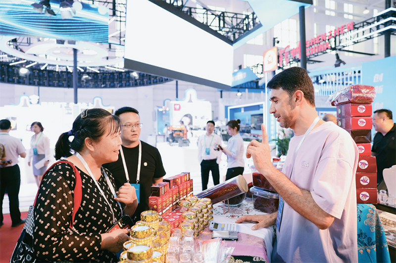 2024年8月17日,第十四屆中國新疆喀什·中亞南亞商品交易會在新疆喀什開幕,來自35個國家和地區(qū)的158家外商企業(yè)、550家國內(nèi)企業(yè)參展。圖為開幕當(dāng)日,國外參展商向參觀者介紹商品。 新華社記者 尚升/攝