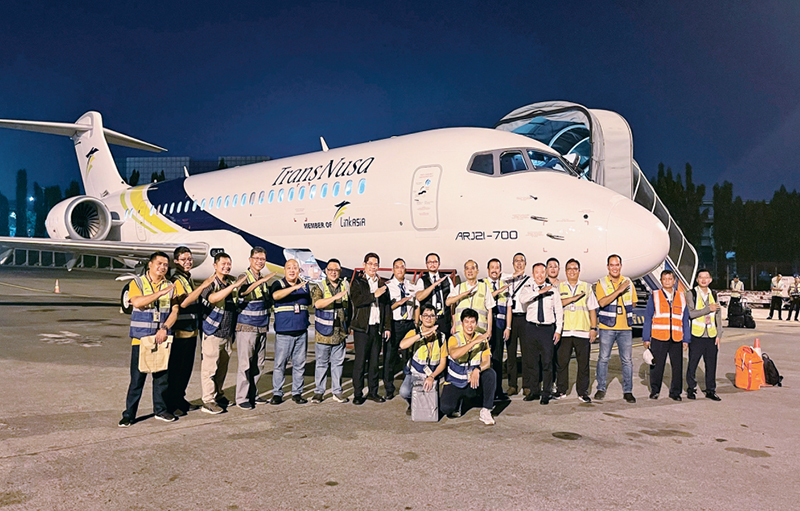 2024年5月31日傍晚,中國飛機(jī)租賃集團(tuán)向印度尼西亞翎亞航空交付的第三架國產(chǎn)噴氣式ARJ21飛機(jī)抵達(dá)印尼首都雅加達(dá)。這是國產(chǎn)飛機(jī)的首單人民幣跨境結(jié)算交易。圖為抵達(dá)當(dāng)日,工作人員在國產(chǎn)噴氣式ARJ21飛機(jī)前合影。 新華社發(fā) 印尼翎亞航空供圖