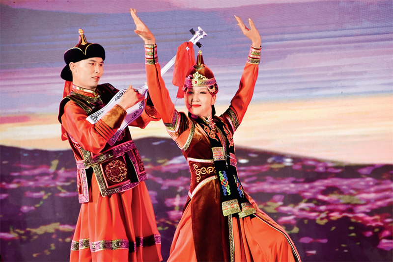 《瑪納斯》、《格薩爾》、《江格爾》三大民族英雄史詩是被納入我國第一批國家級非物質(zhì)文化遺產(chǎn)名錄的文化瑰寶。2023年7月13日晚,在新疆克孜勒蘇柯爾克孜自治州舉行的第九屆瑪納斯國際文化旅游節(jié)上,三大史詩同臺會演,吸引眾多觀眾前來觀看。圖為新疆博爾塔拉蒙古自治州歌舞團(tuán)演員在表演《江格爾》。新華社記者 張瑜/攝