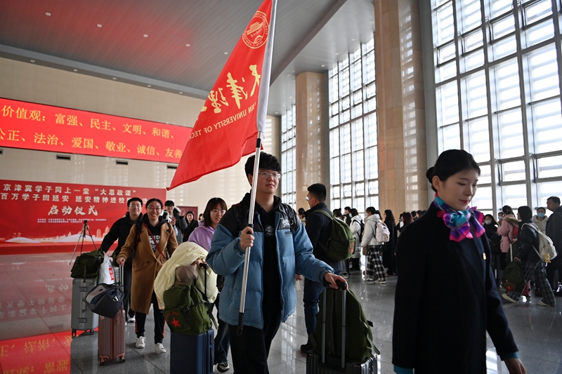 2023年12月4日,京津冀學子同上一堂“大思政課”暨“百萬學子回延安 延安精神進校園”活動啟動儀式在天津火車站舉行。來自北京師范大學、南開大學、河北工業(yè)大學等13所高校的約300名師生,赴延安開展為期一周的紅色研學實踐活動。圖為啟動儀式當日,天津理工大學師生準備進站前往延安。新華社記者 李然/攝