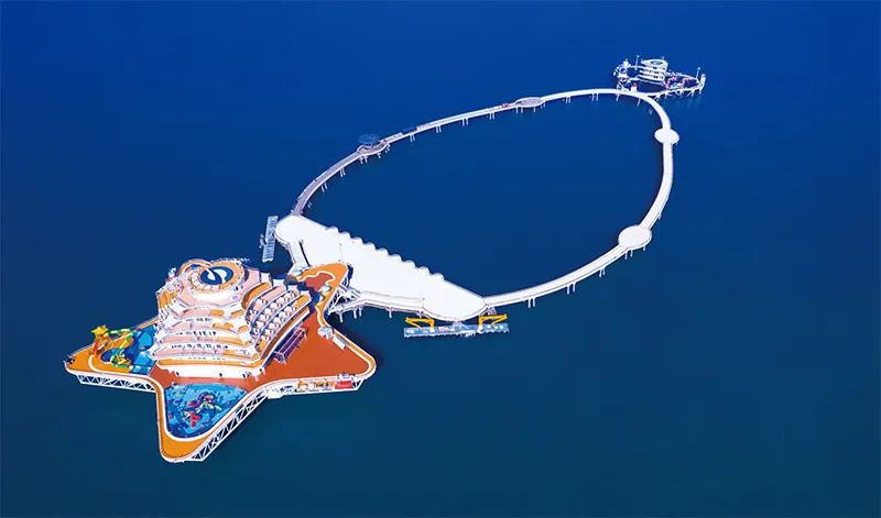 位于山東煙臺(tái)四十里灣海域的“耕海1號(hào)”海洋牧場(chǎng)綜合體,集漁業(yè)養(yǎng)殖、海洋文旅、科普教育等功能于一體,實(shí)現(xiàn)了第一產(chǎn)業(yè)和第三產(chǎn)業(yè)的深度融合。圖為2023年4月28日拍攝的“耕海1號(hào)”海洋牧場(chǎng)綜合體。山東省委宣傳部供圖