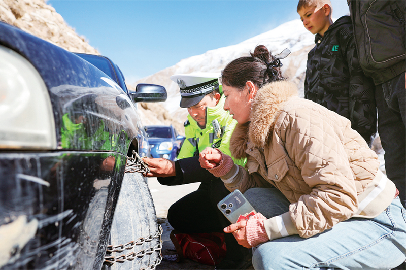 多年來,當(dāng)學(xué)生寒暑假大規(guī)模返校和回家時(shí),新疆葉城縣都會(huì)組織黨員干部帶隊(duì),動(dòng)員縣、鄉(xiāng)、村三級(jí)力量,用心用情守護(hù)上學(xué)路。圖為2024年2月22日,在前往西合休鄉(xiāng)中心小學(xué)翻越海拔4000多米的雪山途中,駕駛員和葉城縣公安局交通管理大隊(duì)工作人員一起為接送學(xué)生的車輛安裝防滑鏈。?新華社記者 胡虎虎/攝