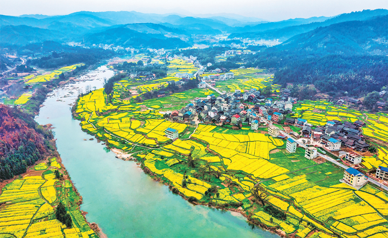 民族要復(fù)興,鄉(xiāng)村必振興。財(cái)政部門完善多元化投入機(jī)制,加快農(nóng)業(yè)農(nóng)村現(xiàn)代化,推進(jìn)鄉(xiāng)村全面振興。圖為2024年3月9日,湖南省懷化市通道侗族自治縣縣溪鎮(zhèn)香坪村,金黃的油菜花田與村莊、青山、綠水相互輝映。人民圖片 田其珍/攝