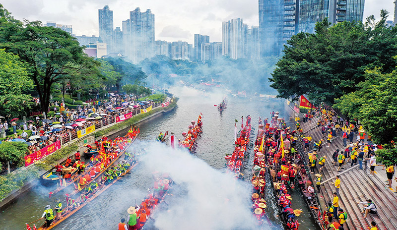 中國式現代化是物質文明和精神文明相協(xié)調的現代化。獵德村是位于廣東廣州珠江新城一座歷史悠久的古村。每年端午期間,獵德村民都會遵照嶺南龍舟文化習俗,在祠堂和河涌,用各種充滿儀式感的“龍船景”展示對端午文化的傳承。圖為2024年6月10日,十里八鄉(xiāng)的龍舟匯聚在獵德涌參加“龍船景”。 新華社記者 劉大偉/攝