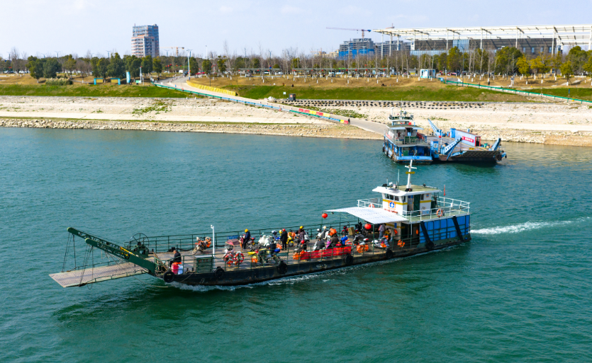農(nóng)歷臘月十九,春運第五天,早上八點,湖北枝江的余家溪碼頭,靠岸的客渡船和汽渡船已經(jīng)掛上了燈籠、拉起了橫幅“平安渡運 歡迎回家”。待渡的返鄉(xiāng)轎車和運輸貨車排著長隊,從碼頭入口處一直延伸到主路百米以外。記者從江北的余家溪碼頭搭乘汽渡船,近九點才抵達(dá)彼岸的百里洲。
